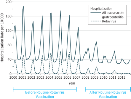 - Leshem E, Tate JE, Steiner CA, et al. Acute gastroenteritis hospitalizations among US children following implementation of the rotavirus vaccine. JAMA 2015;313:2282-4.